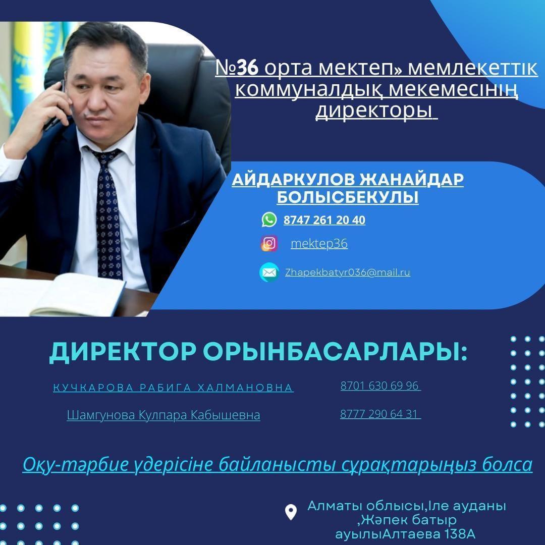 Іле аудандық Білім бөлімінің 15.01.2022ж 29-б н/қ бұйрығына сәйкес 1,2,3,4,5 сынып оқушылары штаттық режимде, ал 6,7,8,9,10,11 сынып оқушылары онлайн форматта оқитын болады. Қосымша сұрақтарыңыз болса, төменде көрсетілген номерлерге хабарласа аласыздар!!!