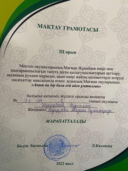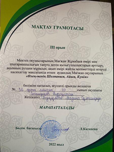 “Өлең- менің Шолпаным, Айым, Күнім” мәнерлеп оқу бағыты бойынша мектебіміздің 10 “А”- сынып оқушысы Согиндиков Нурсултан жүлделі ІІІ орын иеленді.