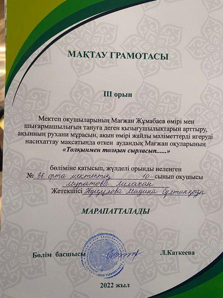 “Ақын да бір бала ғой айға ұмтылған” арнау бағыты бойынша 6 “в”- сынып оқушысы Жупарбаев Нурахмет жүлделі ІІІ орынды иеленді. Сондай -ақ, “Толқынмен толқын сырласып…” зерттеу жұмысы бағыты бойынша 10”А”- сынып оқушысы Муратова Лилахан жүлделі ІІІ орын иеленді.Жетекшісі:қазақ тілі мен әдебиет пәнінің мұғалімі М.Абдіқұлова.