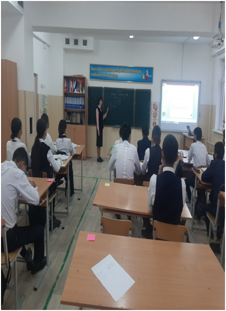 Мұғалім «Миға шабуыл» әдісі арқылы сабақты үй тапсырмасын сұрап, өткен сабақты қайталау арқылы сұрап өтті. Тірек сызбасы арқылы сәйкестендіру тапсырмалары берілді. Интербелсенді тақтаның көмегімен жаңа тақырыпты түсіндіре отырып, оқушыларда жұптық жұмысты тиімді пайдалана білді. Жұптық жұмыс, жеке жұмыстар жүргізілді. Сабақ соңында оқушылардан кері байланыс алынды.