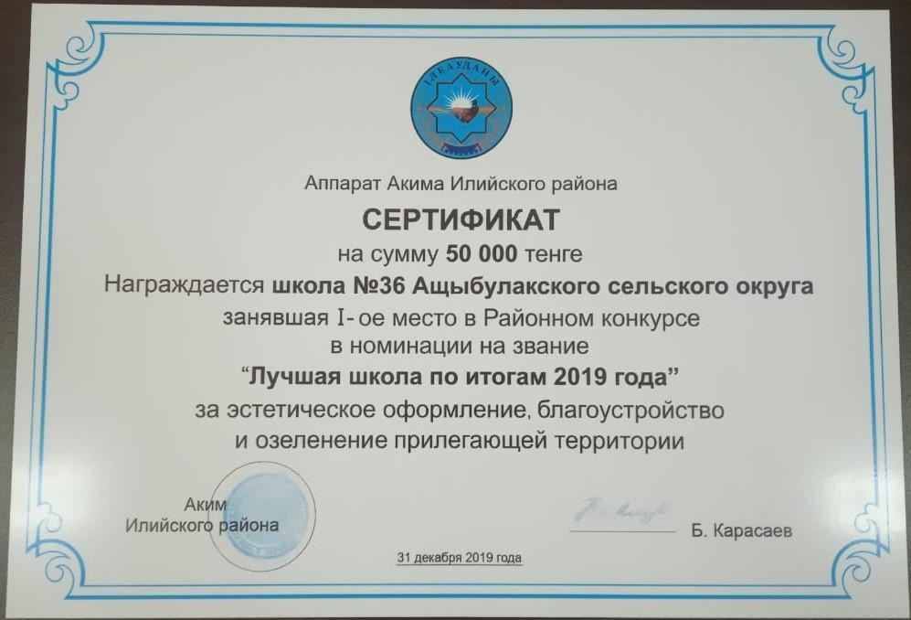 31 декабрь 2019 0 1 2 3 4 5 Асқақ абыройлы асу мектеп ұжымының қажырлы еңбегінің нәтижесі бағаланып, аудан әкімінің арнайы қаржылай сертификатына ие болды.