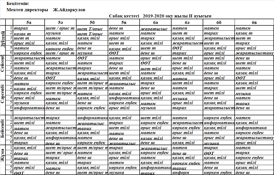 Сабақ кестесі 2019-2020 оқу жылының ІІ ауысымы бойынша