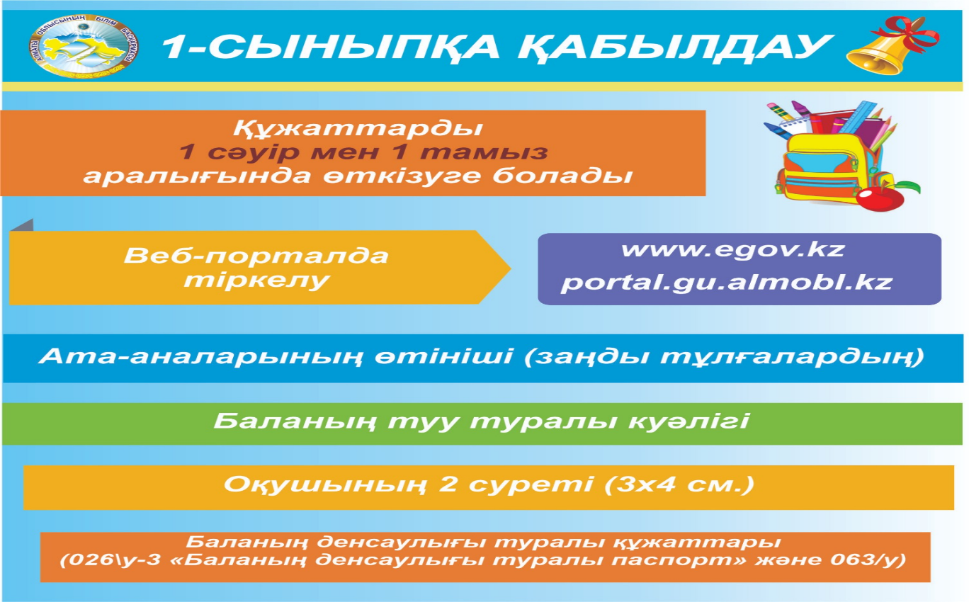 ҚР Білім және ғылым министрінің 2020 ж. 24 маусымдағы №264 бұйрығына сәйкес 2023-2024 оқу жылына 1 сыныпқа құжаттарды қабылдау 1 сәуірден бастап 1 тамыз аралығында gu.almobl.kz және eGOV.kz порталы арқылы жүзеге асырылады. 1 сыныпқа 6 жастағы балалар қабылданады. Сонымен қатар, ағымдығы жылы 6 жасқа толатын ,яғни ,31 желтоқсанға дейін алты жасқа толатын балалар да бірінші сыныпқа бара алады.